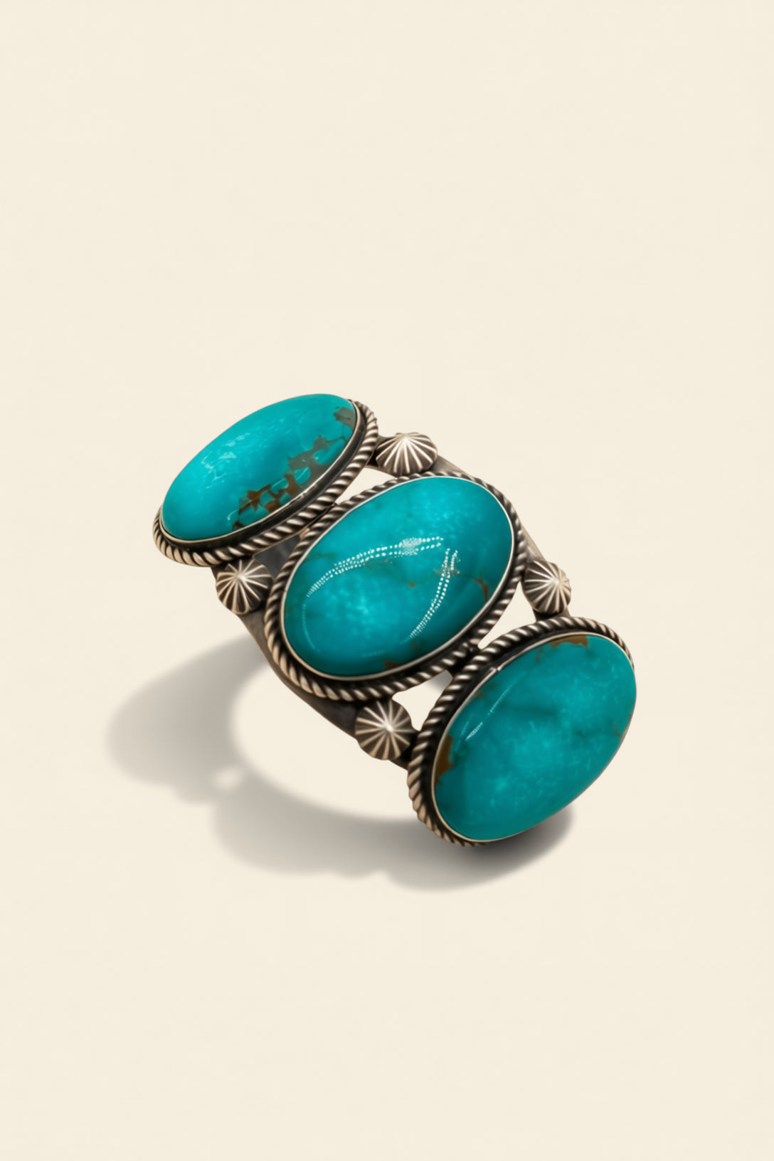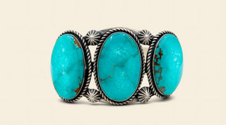 Jewelry on a blue background with 'NATIVE AMERICAN CRAFTED PIECES' text and 'SHOP NOW' gold button