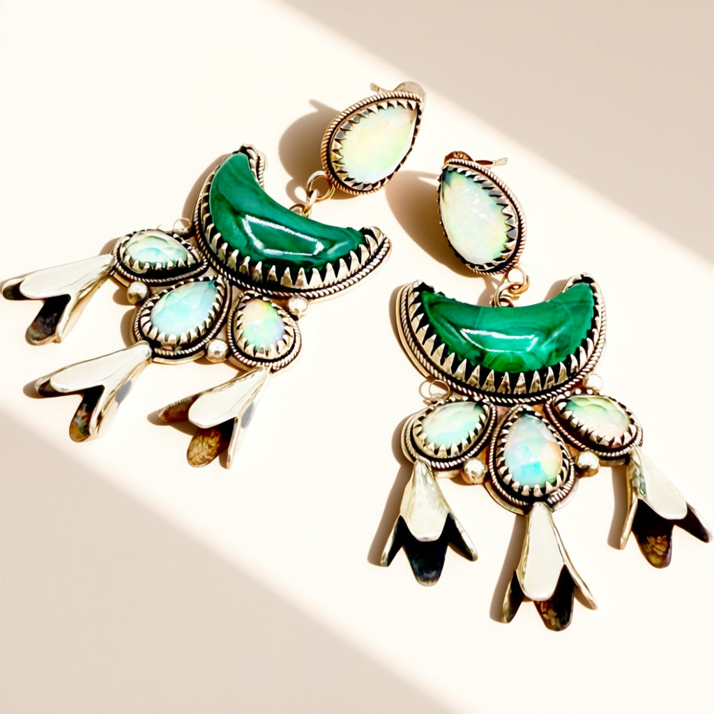 Designed by HJC, these sterling silver earrings feature Malachite and Opal and measure approximately 2.5 inches in length.