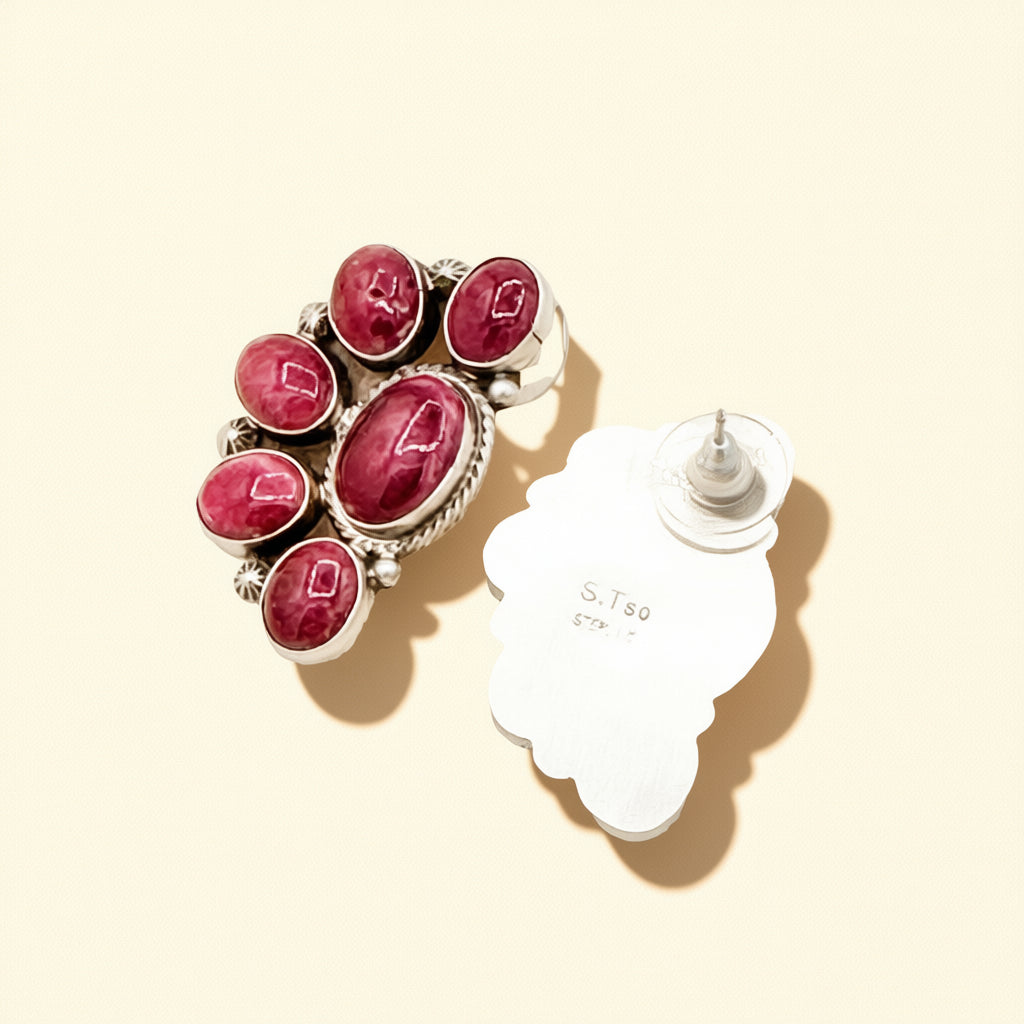 Handcrafted by Sheila Tso, these sterling silver half cluster earrings feature rich Purple Spiny Oyster with a 1.25 inch drop and post-back closure.