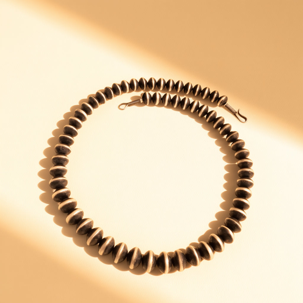 Handcrafted by Brennon Kevin Cadman in sterling silver, featuring 12mm Navajo Pearls. Measures 24 inches in length.