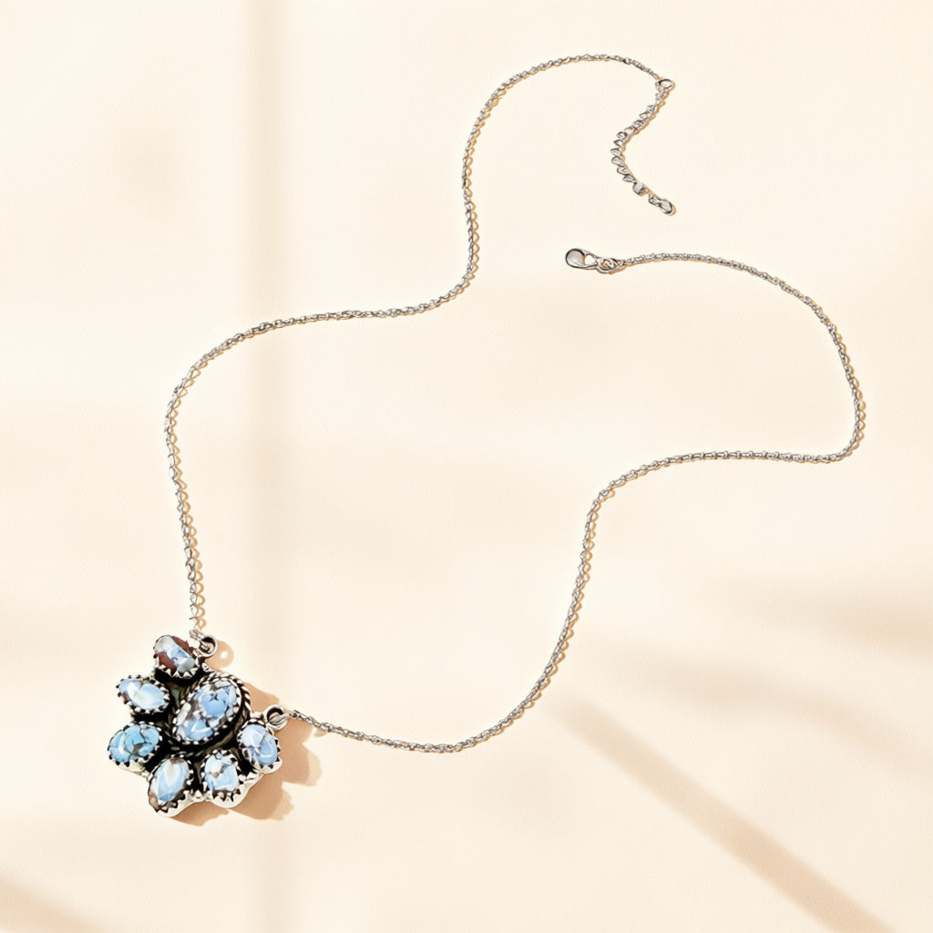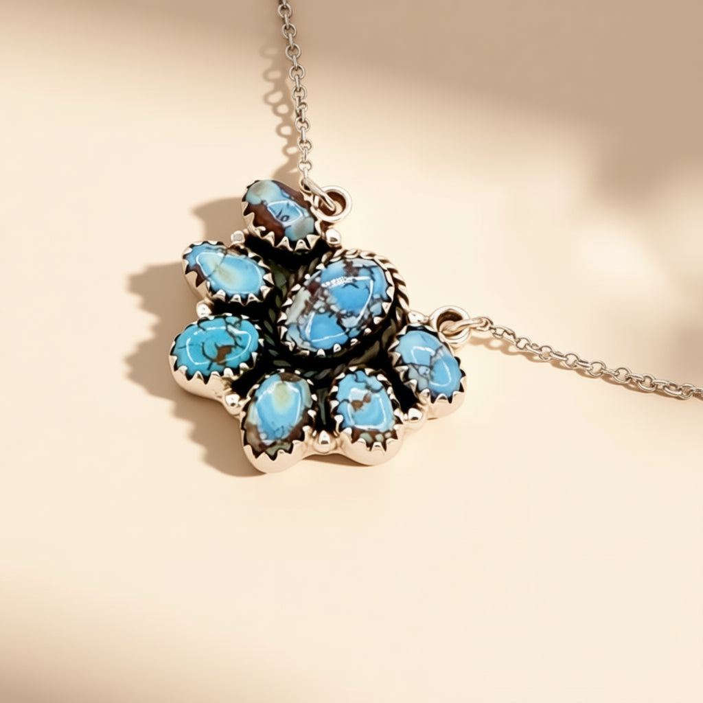 Designed by HJC, this sterling silver necklace features a half cluster of softly toned Golden Hills Turquoise stones set in a sculptural, balanced composition. Measures 18 to 20 inches.