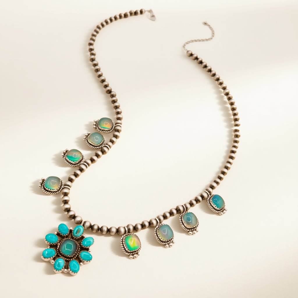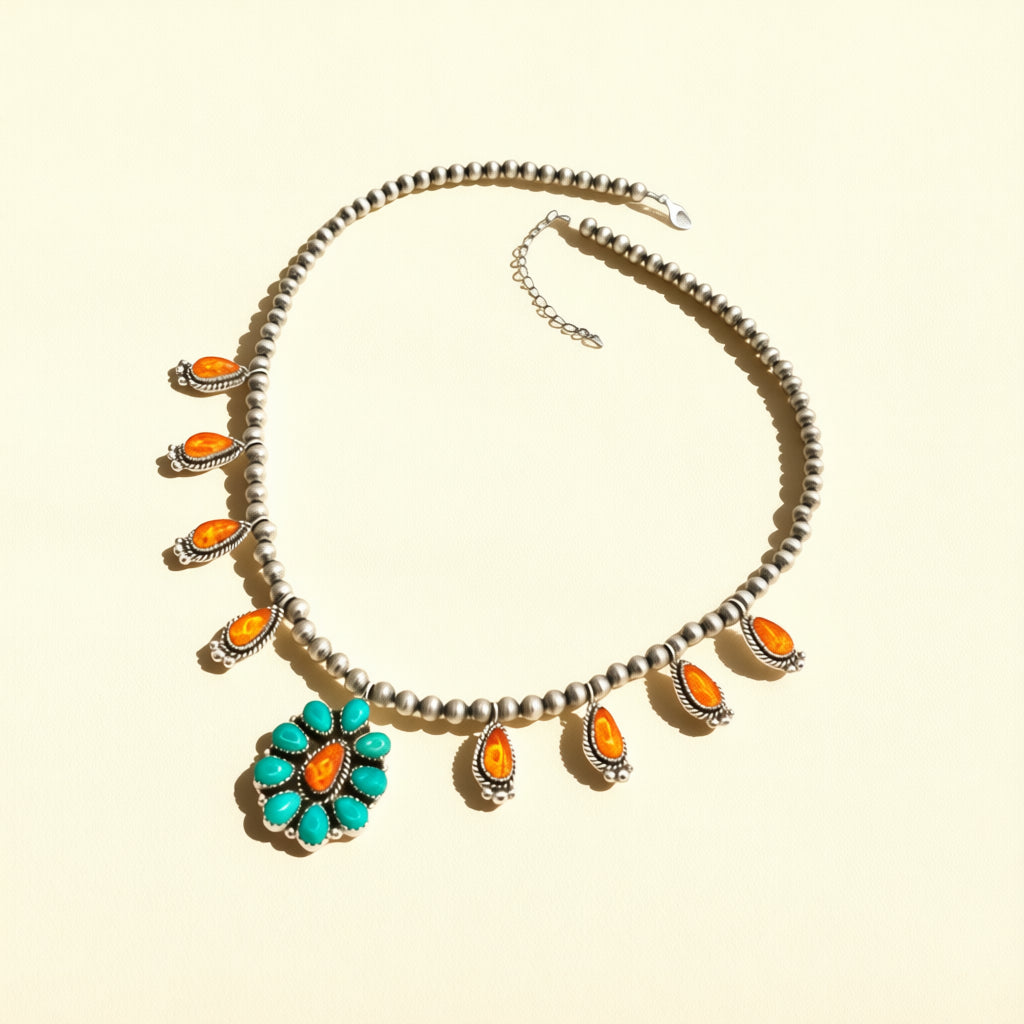 This necklace suits someone who dresses with confidence and color and allows jewelry to define the look. Worn solo or layered, it brings energy and personality through expressive form and confident styling.
