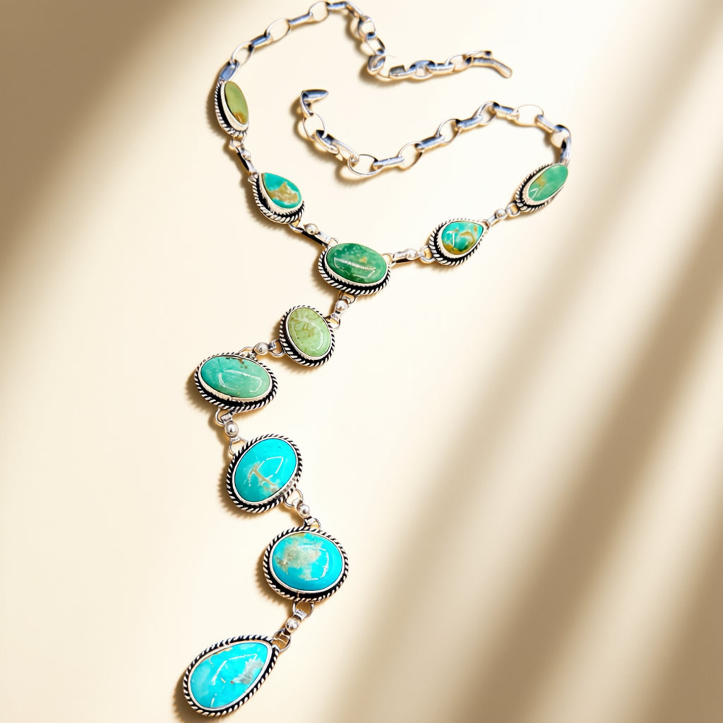 The gradual shift in turquoise tone gives the piece a natural sense of rhythm and balance. Its elongated silhouette draws the eye downward, making it an elegant option for layering or for adding a strong vertical line to an otherwise simple look.
