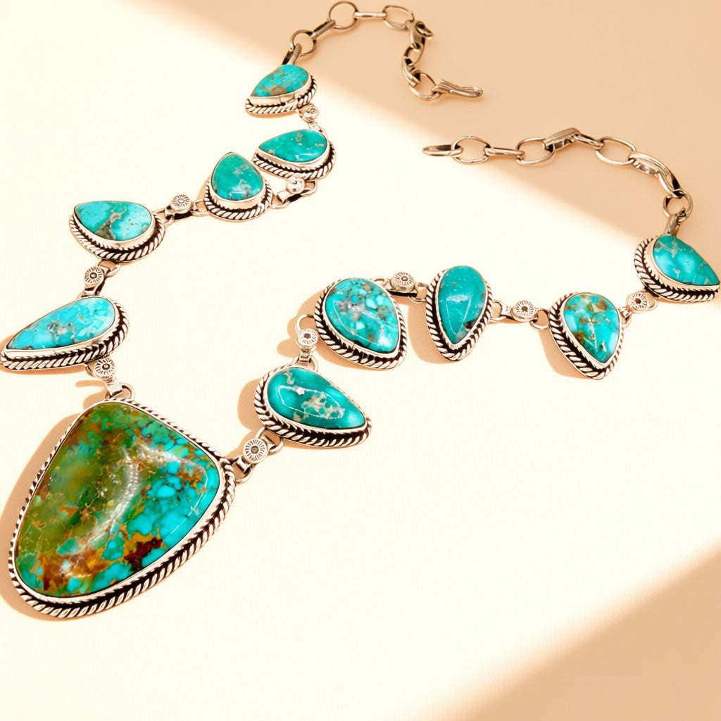 The contrast between the two turquoise varieties creates visual rhythm and depth along the neckline. Fluid silver links and varied stone shapes give the piece a strong sense of movement, making it an expressive choice that stands out while remaining easy to style with both casual and elevated looks.
