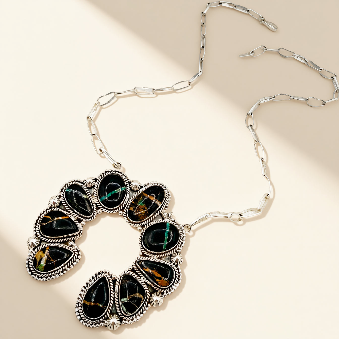 An Eric Ruyak HJC Design, this sterling silver oversized naja necklace features bold teardrop cabochons of Blackjack Turquoise arranged in a dramatic crescent silhouette. The naja measures 2 inches and is handmade.
