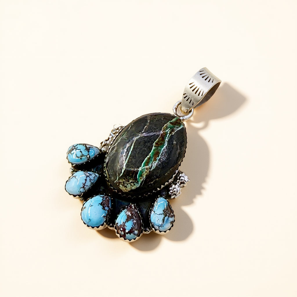 Designed by HJC in sterling silver, this pendant features a Blackjack turquoise framed by Golden Hills turquoise in a clustered composition.
