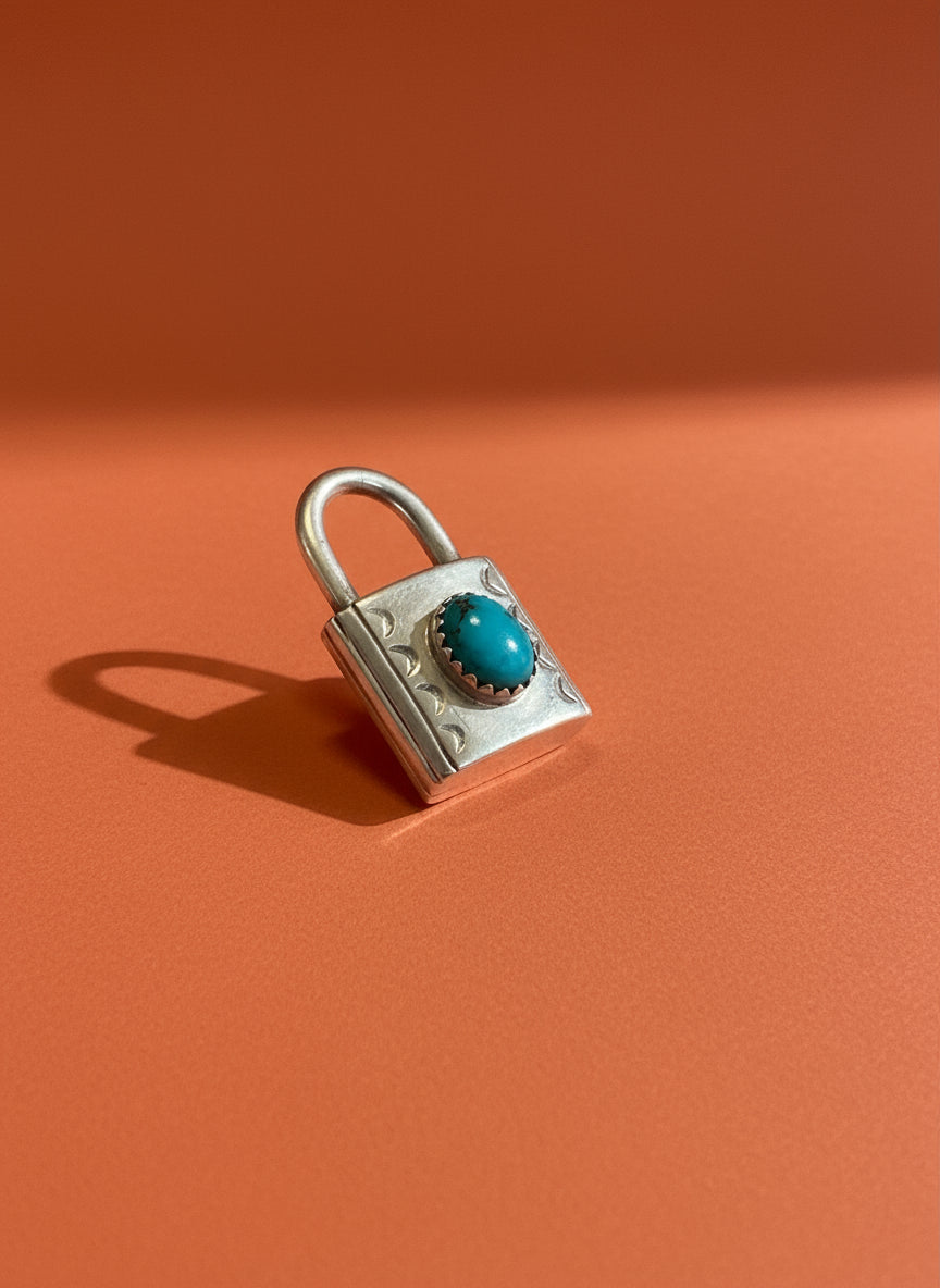 Handcrafted in sterling silver, this lock charm brings together classic Native stamping and a punch of natural turquoise in the coolest little silhouette. It’s authentic, it’s expertly made, and holy fuck is it adorable. Hook it on a chain, stack it with pendants, or let it stand alone. Snag it before I do.