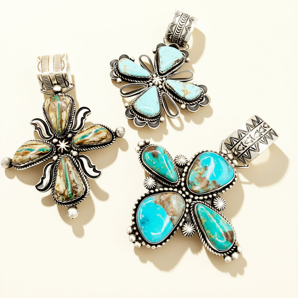 Handcrafted by Alex Sanchez, these sterling silver pendants feature turquoise from the Four Corners region. Each pendant measures approximately 4 inches in length.