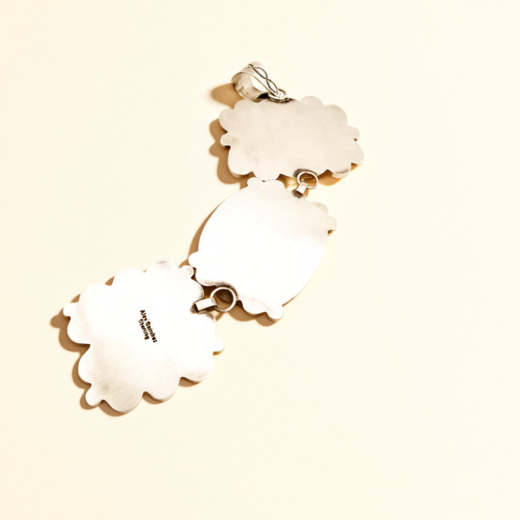 Handcrafted by Alex Sanchez, this sterling silver pendant features Emerald Rose turquoise in a three stone composition. The pendant measures approximately 7 inches in length.