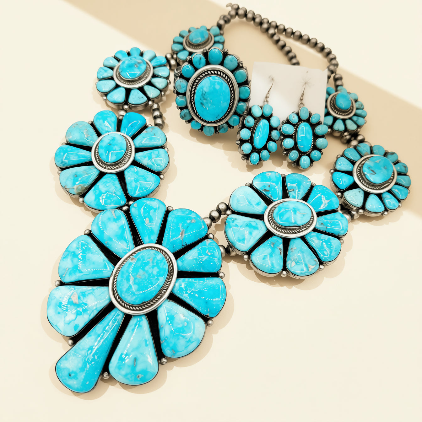 Blue Ridge speaks to open sky and wide horizons, and this set carries that expansive energy from collarbone to wrist. Worn together, it creates a commanding presence at gallery openings, milestone celebrations, or any moment that calls for unforgettable turquoise.