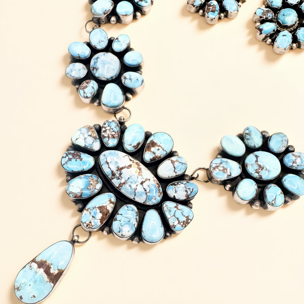 Handcrafted by Marie Tsosie, this set features Golden Hills turquoise in sterling silver, with a 28-inch necklace and 1.5-inch clusters.