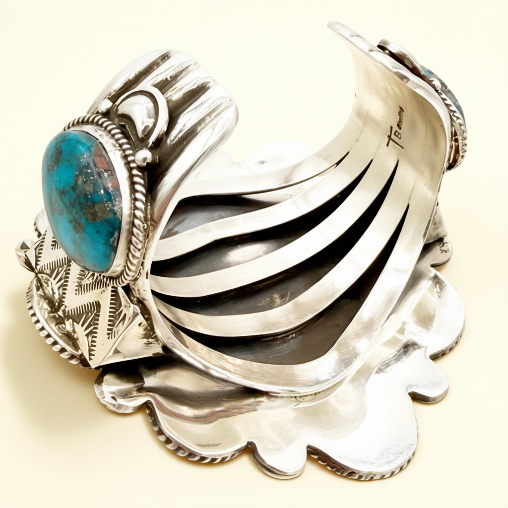 This piece brings vibrant energy to everyday styling and adds powerful dimension to evening looks. Whether worn as a signature turquoise accent or layered into a bold Southwestern stack, it stands out with color, texture, and artisan presence. Substantial in scale yet beautifully balanced, this cuff embodies the artistry and craftsmanship at the heart of Southwestern jewelry. A striking turquoise statement that honors traditional craftsmanship while delivering modern, collectible style.